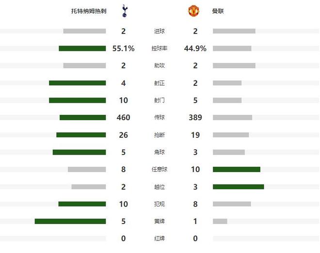 第62分钟热刺中场抢断后,第一时间推反击,约翰逊虽然单刀破门,但越位在先导致进球被取消,狂攻不止的热刺,终于在第84分钟扳平比分,替补登场的特尔,禁区内转身抽射让拉门斯无可奈何,将比分追至1平,起势的热刺在伤停补时第91分钟反超比分,奥多贝尔大禁区外开炮,理查利森头球一蹭,将比分改写为了2-1,但曼联也没有放弃,德利赫特最后时刻的绝平进球,将比分定格为了2-2。