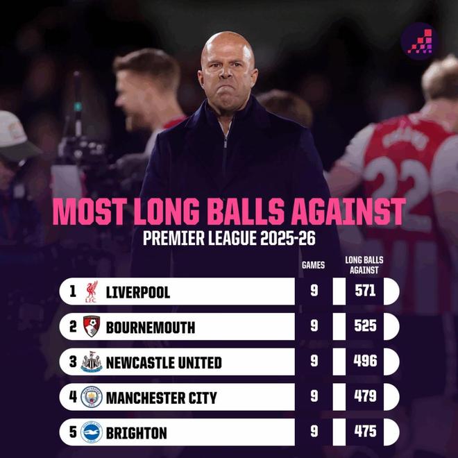 英超前9轮之后的统计数据可以看到,利物浦是承受对方长传发起攻击次数最多的球队,高达571次,排在该项统计英超第4的曼城,比利物浦少了差不多要有100次。