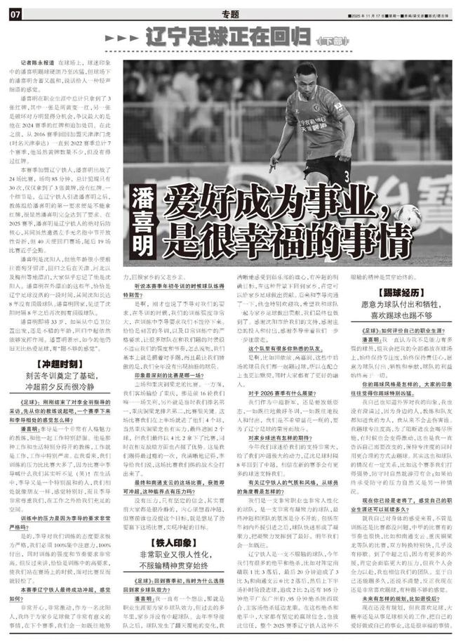 辽宁铁人是一支不服输的球队,今年我们有很多的绝平和绝杀,比如对阵定南赣联1比3落后,最后20分钟追成了3比3;和南通支云0比2落后,然后上下半场补时阶段进球,追成2比2;还有105分钟绝平广东广州豹、95分钟绝杀陕西联合、主客场绝杀延边龙鼎。在这些绝杀和绝平中,大家都有坚定的赢球信念,也彼此信任,整个2025赛季辽宁铁人这种不服输的精神是贯穿始终的。