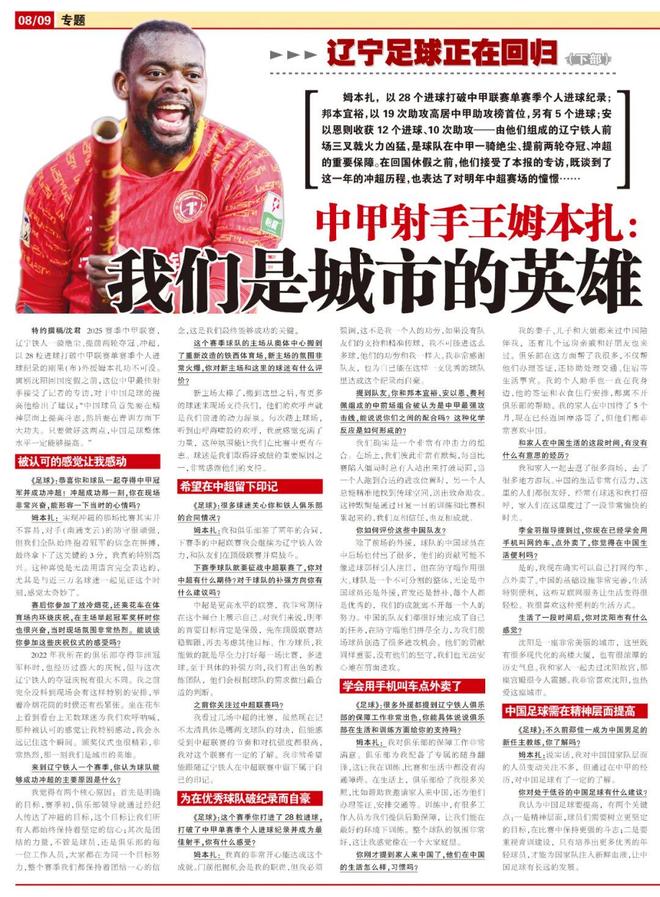 特约撰稿/沈君2025赛季中甲联赛,辽宁铁人一骑绝尘、提前两轮夺冠、冲超,以28粒进球打破中甲联赛单赛季个人进球纪录的刚果(布)外援姆本扎功不可没。离别沈阳回国度假之前,这位中甲最佳射手接受了记者的专访,对于中国足球的提高他给出了建议:“中国球员首先要在精神层面上提高斗志,然后要在青训方面下大功夫。只要做好这两点,中国足球整体水平一定能够提高。”