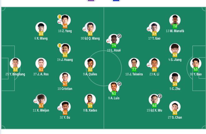 中场:10-特谢拉(F)、15-吴曦、17-高天意(68’7-徐皓阳)、23-李可(46’33-汪海健);