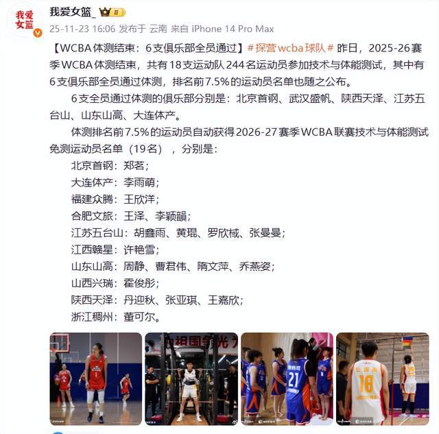 通过体测,共有6支球队全员通过了体测,其中就包含山东女篮。其他5支球队则是北京女篮、武汉女篮、陕西女篮、江苏女篮和辽宁女篮。