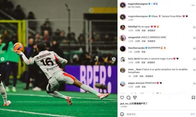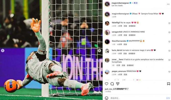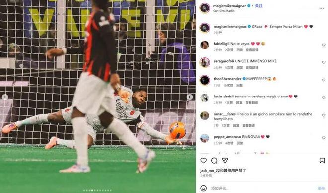 迈尼昂也在赛后通过社媒晒出自己的多张扑救照,并配文:“哈! 永远佛砸米兰❤️”