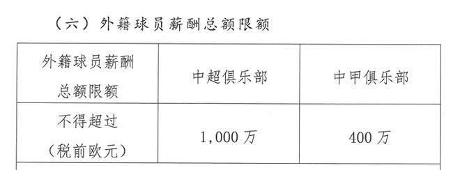外籍球员个人年薪上限为中超300万欧元、中甲150万欧元;俱乐部外援薪酬总额上限为中超1000万欧元、中甲400万欧元。