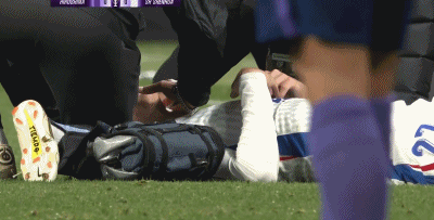 第33分钟,陈晋一与对手头部相撞,接受队医治疗
