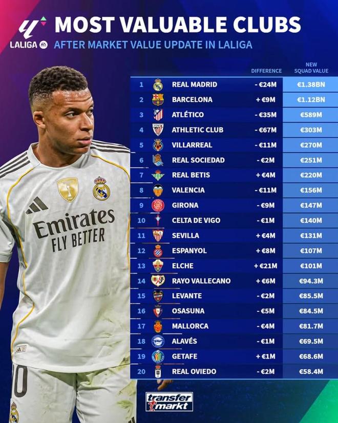 德转更新后西甲俱乐部身价排行榜: