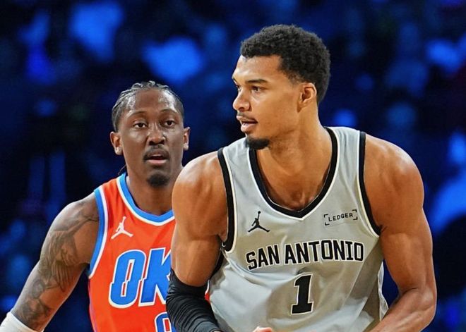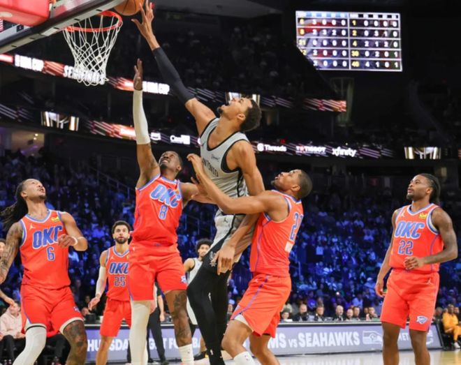 历史上独一档,同样打破NBA纪录。值得一提的是,本场比赛,雷霆终于迎来最强五虎的赛季首次合体,此前杰威和哈滕轮流受伤,雷霆一直都是一套残阵在应战。而马刺这边,此前文班亚马遭遇小腿拉伤,但马刺在福克斯和卡斯尔带领下,同期取得9胜3负的战绩,始终保持在第二梯队,球队阵容厚度也是联盟第一档。赛前马刺主帅确认,本场比赛文班亚马可以出战,但有时间限制。比较意外的是,马刺这边安排文班亚马打替补,首发依旧是福克斯+卡斯尔带队,保持球队原有节奏。回顾一下比赛。