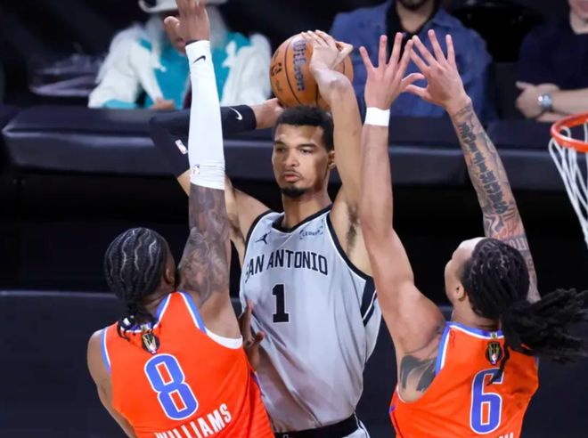 文班亚马不在,马刺很被动,后半段他重新回来,雷霆最多领先16分,福克斯内外开花,瓦塞尔继续造杀伤,文班亚马也续上三分球,半场结束时,马刺追到46-49。文班亚马一上场,马刺全活了,7分钟正负值+20!进入下半场,霍姆格伦和杰威内突外投,福克斯联合瓦塞尔打出一波10-0高潮反超!文班亚马回来后,亚历山大军训,霍姆格伦抢断打反击,雷霆为了限制文班亚马,三人封堵盖帽,后半段瓦塞尔联合文班亚马守住微弱领先,三节结束时,马刺78-77雷霆。决战第四节,文班亚马大帽霍姆格伦,随后后仰跳投。