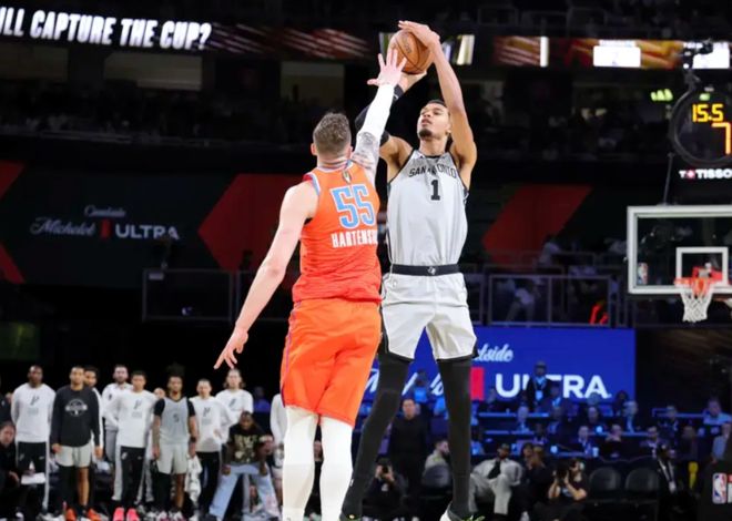 文班联合福克斯连续上分,不过杰威和卡鲁索很快追平。中段卡鲁索继续劈扣+上篮,卡斯尔带队反超比分后,亚历山大开始造犯规,文班亚马暴扣+瓦塞尔三分打停雷霆。杰威关键三分反超,文班亚马继续单打+抢篮板造杀伤。马刺拉开4分差距,最后1分钟,杰威继续打铁,文班亚马罚球不中给雷霆机会,亚历山大铁血追2分,卡斯尔两罚全中。雷霆最后10秒落后3分,两队点球战术,最终马刺111-109惊险击败雷霆,终结雷霆16连胜,马刺和尼克斯会师NBA杯决赛!