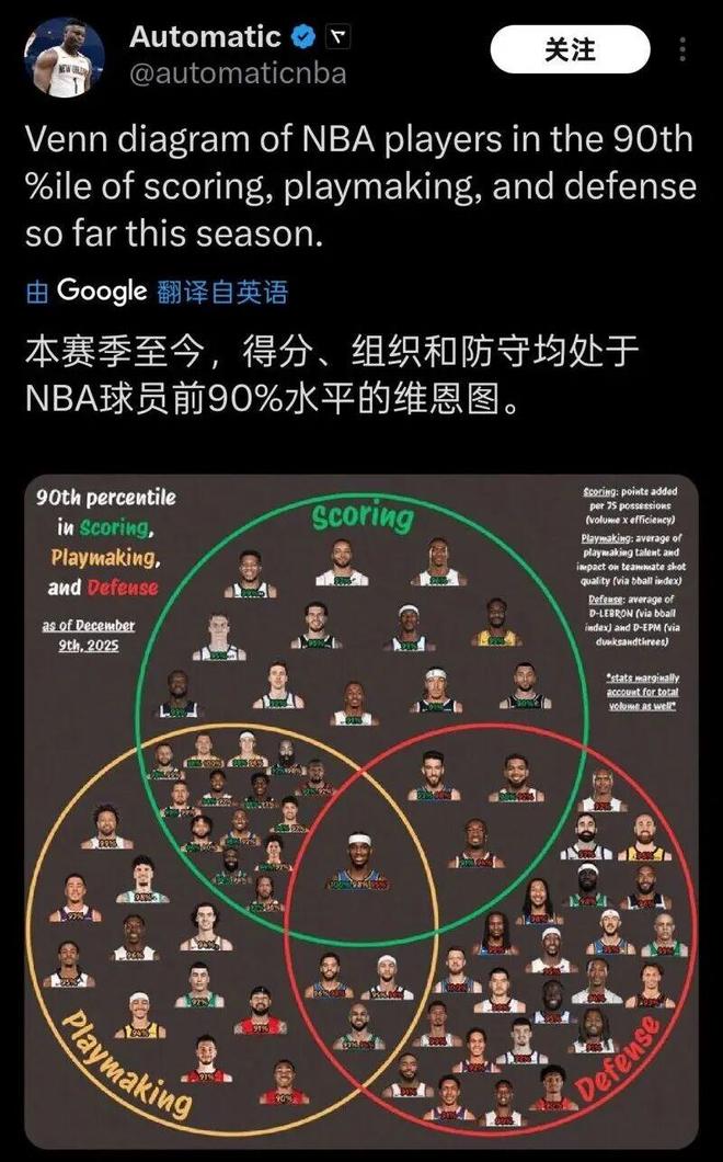 得分、组织和防守均在NBA球员前90%,仅亚历山大一人。