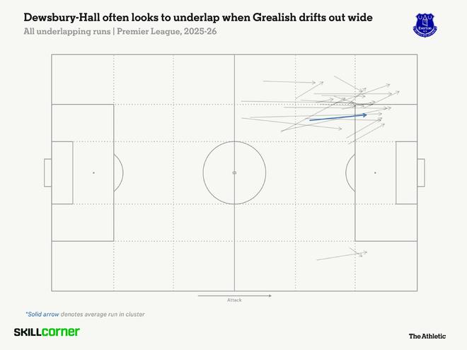 在欧洲五大联赛至少出场10次的中场球员中,只有森林队的埃利奥特-安德森(31次)的“内套插上跑动”次数超过了他的26次。我们可以看到,其中很大一部分是那些从左路内套插入禁区的跑动。其中一半是在格拉利什持球时进行的,显示了两人的配合频率。这有助于埃弗顿成为一支更具创造力和变化多端的进攻力量。