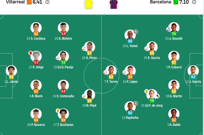 比利亚雷亚尔首发:1-路易斯·儒尼奥尔、4-马林、12-维加、23-卡尔多纳、26-纳瓦罗、10-帕雷霍(75’37-马西亚)、14-康萨尼亚、17-布坎南、19-佩佩(75’21-奥卢瓦塞伊)、20-莫莱罗、22-阿约泽·佩雷斯(66’9-米卡乌塔泽)。
