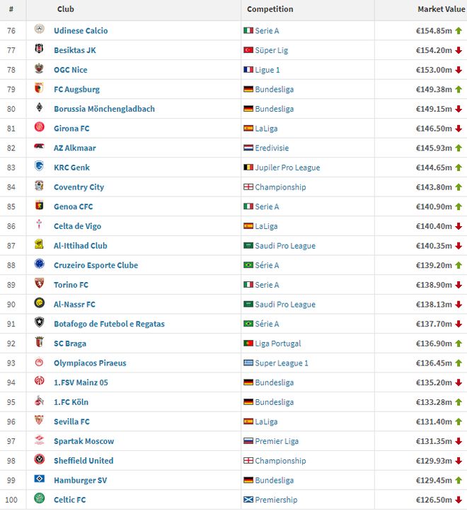 在亚洲球队里,利雅得新月排名最高,以1.92亿排名第62位,其次是吉达国民(第71位,1.63亿)、吉达联合(第87位、1.40亿)以及利雅得胜利(第90位、1.39亿)。
