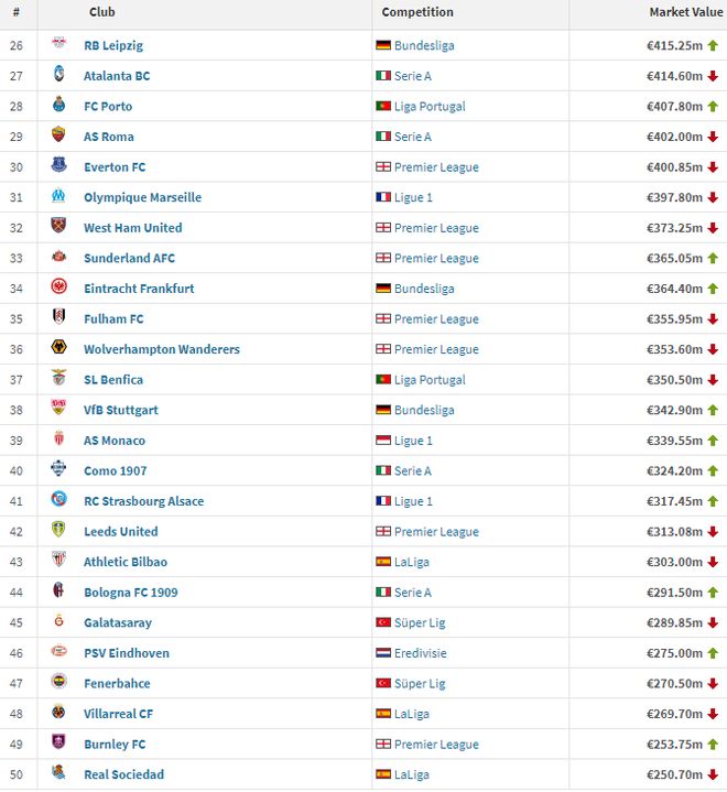 跻身前10的球队,还有排名第4位的巴黎圣日耳曼,排名第6位的巴萨以及排名第8位的拜仁。除了五大联赛球队之外,葡萄牙体育以4.63亿排名最高,但仅排名第23位。