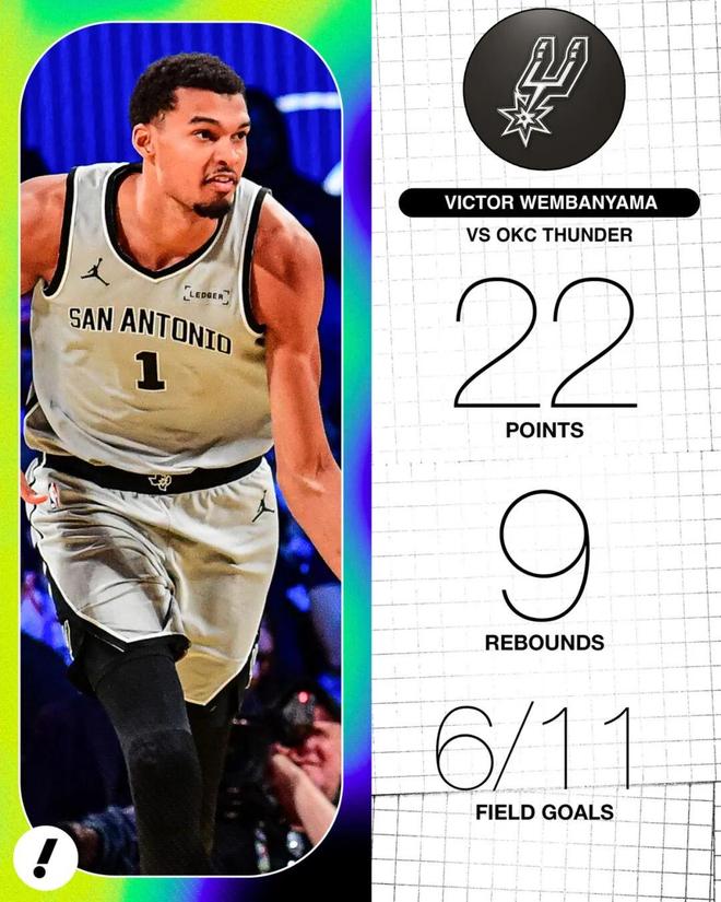 ——两队第一次交手在NBA杯半决赛,那场马刺最多落后16分,文班亚马替补成为奇兵(只打了20分钟,拿了22分9篮板2助攻,正负值+21),马刺111-109险胜雷霆2分