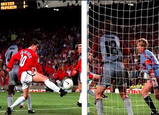 补时第1分钟,贝克汉姆开出角球,谢林汉姆打进绝平球!接着又是小贝开出的角球,索尔斯克亚打进绝杀球!