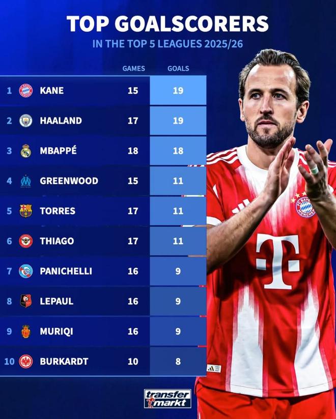 北京时间12月27日,德转统计出了本赛季至今欧洲五大联赛进球最多的10名球员,哈里-凯恩和哈兰德同以19球排名第一,姆巴佩18球位列第三,此外格林伍德和费兰-托雷斯也都榜上有名。