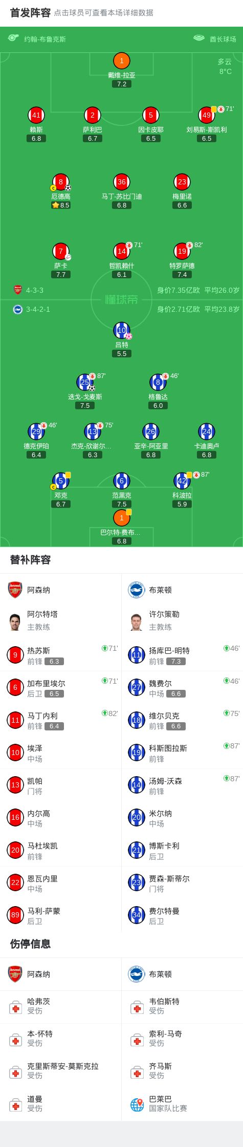 北京时间12月27日,英格兰足球顶级联赛第18轮展开较量,阿森纳坐镇主场迎战布莱顿。上半场萨卡助攻,厄德高远射攻入赛季首球。下半场赖斯角球造吕特头球乌龙,之后阿里亚抽射中柱,迭戈-戈麦斯补空门扳回一球,之后明特禁区内兜射,拉亚极限扑救。最终阿森纳2-1战胜布莱顿。
