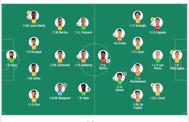 1-拉亚、49-斯凯利(71’6-加布里埃尔)、2-萨利巴、5-因卡皮耶、36-苏维门迪、41-赖斯、23-梅里诺、8-厄德高、7-萨卡、19-特罗萨德(83’11-马丁内利)、14-约克雷斯(71’9-热苏斯)。
