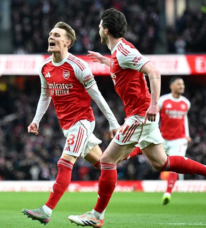 第14分钟狂攻不止的枪手,终于打破了场上的平衡,萨卡右路拿球牵制防守后,将球回做给了厄德高,后者远射破门,打进了自己的赛季首球,帮助阿森纳取得了1-0的领先,这也是萨卡本年度在主场的联赛首个助攻,半场结束前,苏维门迪禁区内的脚后跟射门被封堵,随后特罗萨德的补射直接踢飞。