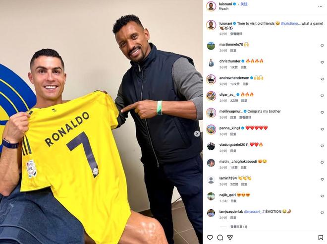 前葡萄牙国脚纳尼前往利雅得探访好友C罗,并现场观看利雅得胜利的比赛,赛后在社交平台发文称赞C罗的表现。