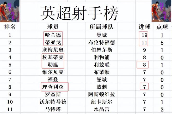 射手榜方面,哈兰德19球继续稳居榜首,蒂亚戈11球位列第2,塞梅尼奥9球排在第3。勒温今天打入一球,追上埃基蒂克,两人8球并列第4。理查利森今天打入2球全被吹掉,还是和福登,马特塔,罗杰斯等人7球刚好挤入前十。