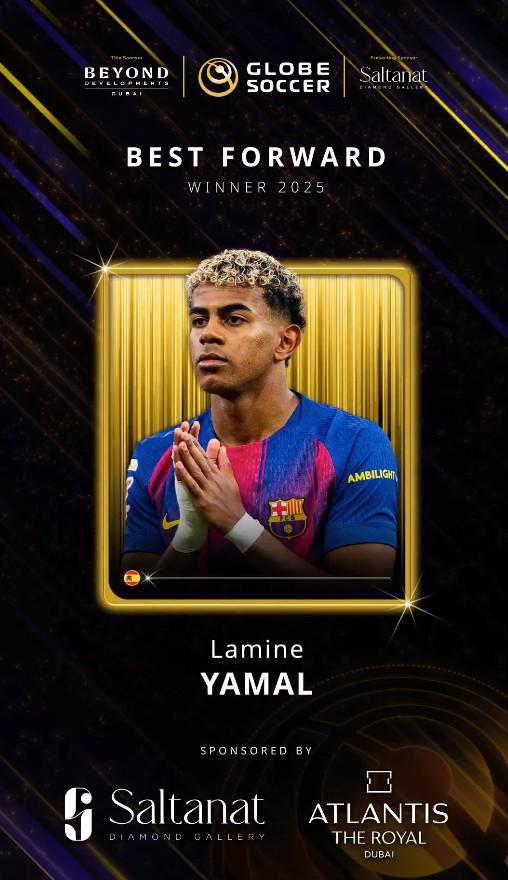 现年18岁亚马尔此前已经获得了此次环球足球奖年度西甲最佳U23球员的奖项,如今这位西班牙球星又拿下了年度最佳前锋的名号。