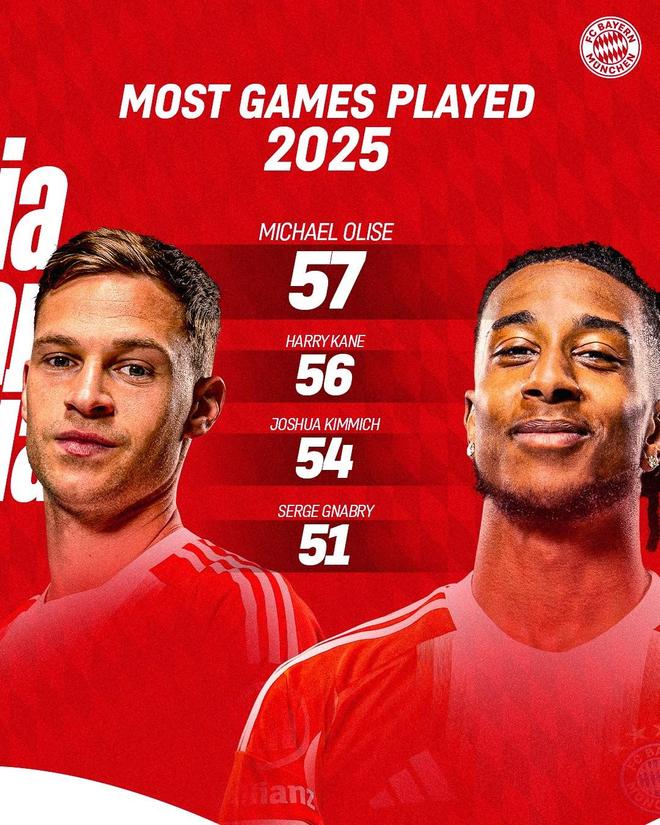 拜仁队内2025年度参加比赛榜: