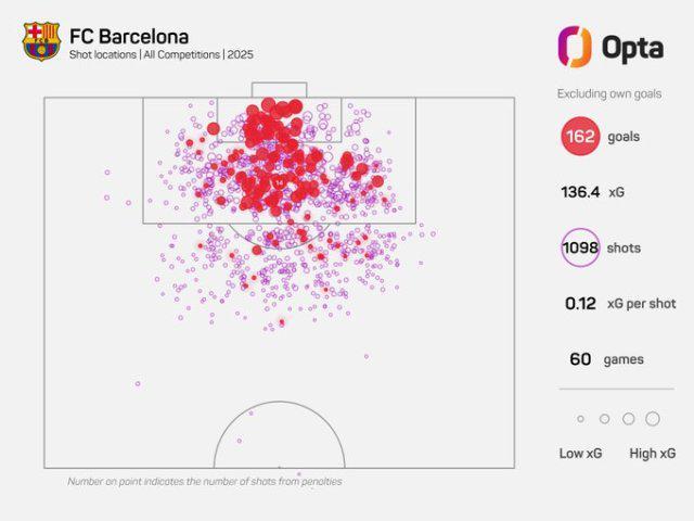 2025年落幕在即,Opta统计,巴萨在年内60场各线比赛之中打入169粒进球(乌龙球包含在内),缔造全新纪录:单一自然年内,阵中既无梅西也无C罗的情况下,西甲球队从未有过如此进球量。堪称张局。