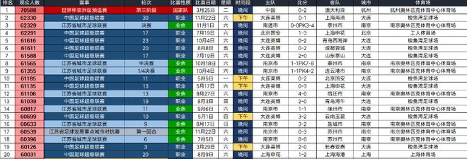 在排名前20位的比赛里,8场是苏超比赛,而且这8场比赛都是在南京奥林匹克体育中心体育场进行。不过,大连英博主场梭鱼湾9场跻身前20位,从而成为跻身前20位最多的球场。