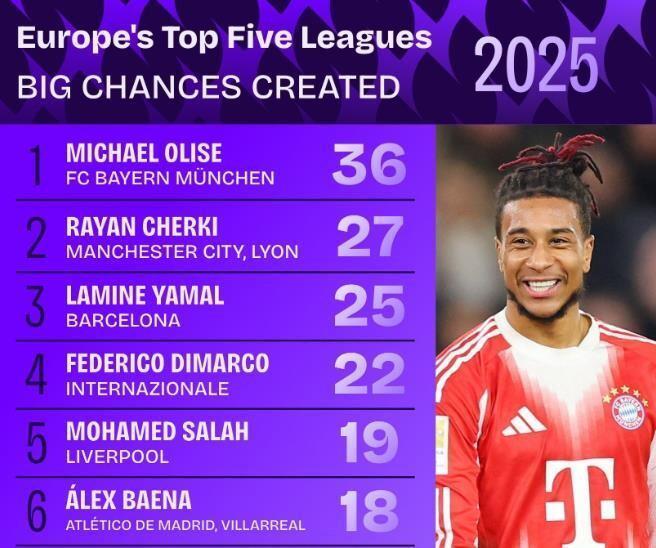数据不会说谎,本赛季意甲赛场,迪马尔科已送出6次助攻,领跑意甲助攻榜,并攻入2球。本赛季意甲12次首发,直接参与8粒进球,对于一名边后卫而言,迪马尔科这样的进攻输出堪称恐怖。而将目光拉长至整个2025自然年,他在五大联赛创造绝佳机会榜单上以22次位列第四,仅次于奥利塞(36次)、谢尔基(27次)和亚马尔(25次),更是这份榜单前十中唯一纯粹的边后卫。