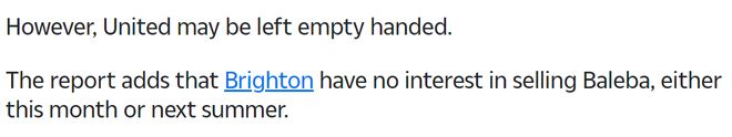 巴莱巴本人非常乐意加盟曼联,老特拉福德自然是比布莱顿更大的舞台,而且可以提供更高的收入。然而布莱顿认为,一名球员如果为了转会不好好踢球,那对任何一方都没有好处。鉴于曼联连续两个转会窗故意扰乱布莱顿球员的专注,他们也打算强势反击,如果报价无法达到本队的要求,就不出售巴莱巴,包括1月份冬季转会窗和今夏的转会窗!