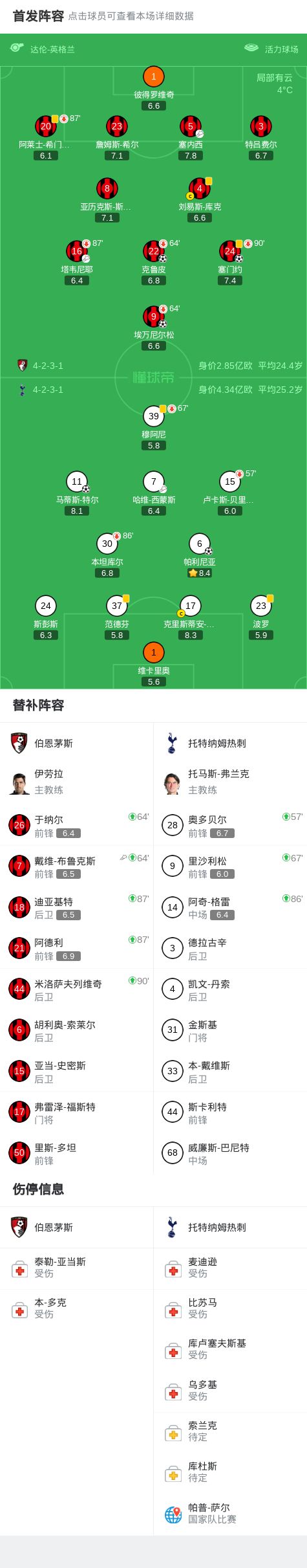 第36分钟,塞内西助攻克鲁皮破门,伯恩茅斯2-1热刺
