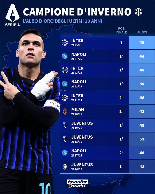 按照意甲的赛程顺序,国米本赛季半程拿到了15胜4负的成绩并成为半程冠军。对此来自德转的统计指出,意甲过去9年的半程冠军中,6队最终都拿到了冠军。