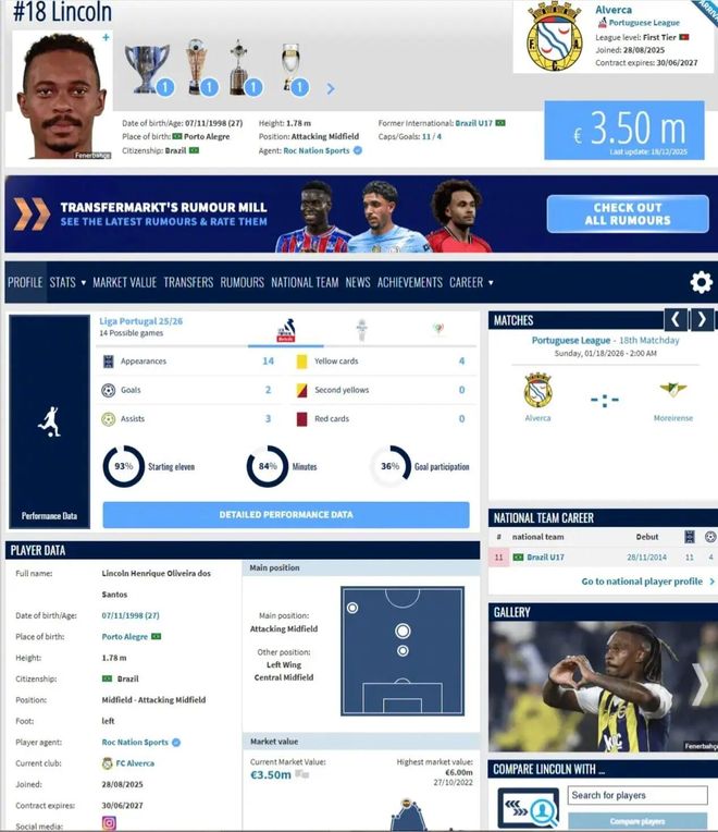 现年27岁的林肯去年夏天从费内巴切以自由身转会加盟艾华卡,本赛季至今其代表球队出战14场葡超比赛,攻进2粒进球并送出3次助攻。德国转会市场网信息显示,林肯的身价为350万欧。