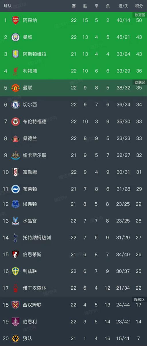 领头羊阿森纳榜首的位置还是比较稳固的,本轮在客场0-0闷平了诺丁汉森林,这一场比赛枪手拥有60%的控球率,15-6的射门次数,但没有转化出进球,马丁内利、赖斯、哲凯赖什、萨卡等人的射门都被拒绝。只拿到一分的枪手积分上涨到50分,领先了第二名的曼城和阿斯顿维拉7分,曼城本轮输给了曼联,阿斯顿维拉的比赛还没有进行,将在主场和埃弗顿一较高下!
