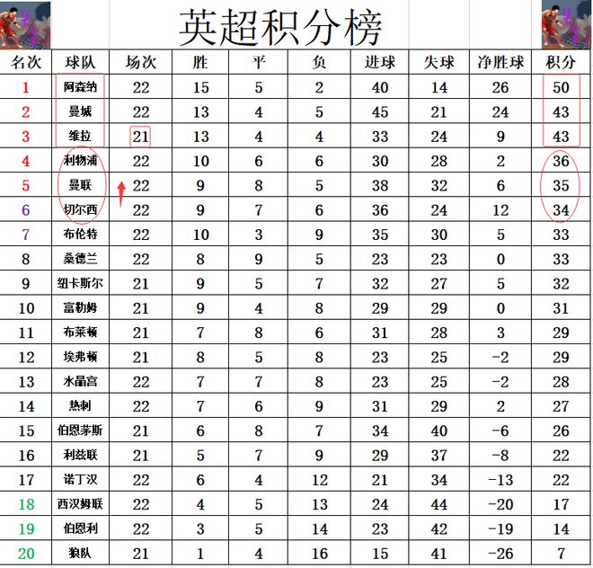 积分榜方面,阿森纳没有抓住大幅度拉大分差的机会,打平后领先曼城7分。曼城德比大战不敌曼联,不仅不能追赶阿森纳,第2的位置也可能保不住了。利物浦今天也没有赢球,被曼联和切尔西追上来,争4再次热闹起来,曼联,切尔西分别差利物浦1分,2分升至第5,第6。