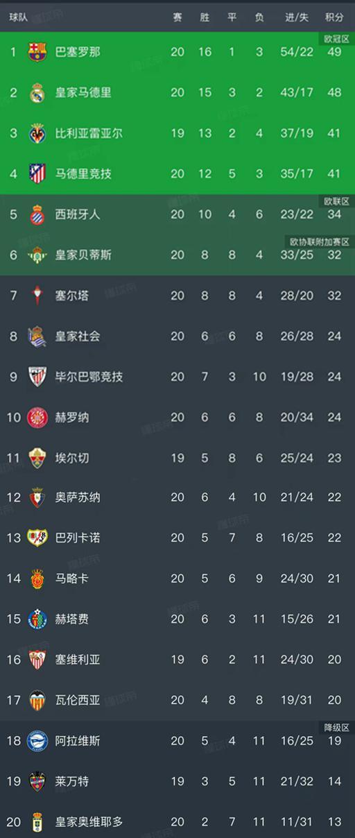 前四名的球队积分都已经突破了40分,已经领先了身后的球队至少7分,整体的优势明显。西班牙人0-2不敌赫罗纳,积分停留在34分暂列第5名。塞尔塔3-0完胜巴列卡诺迎来三连胜,以32分暂列第7名。排在最后三名的球队分别是19分的阿拉维斯、14分的莱万特、13分的皇家奥维耶多!