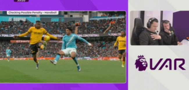 周六,在曼城对阵狼队一战,首次在英超担任主裁判的哈拉姆做出争议判罚。马尔穆什禁区内挑球,球被莫斯奎拉用胳膊阻挡,哈拉姆第一时间并未判罚点球。