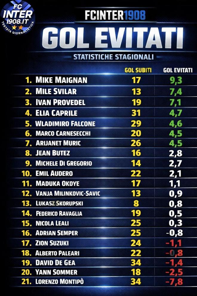 1. 迈尼昂(AC米兰) 21场丢17球 阻止进球9.3
