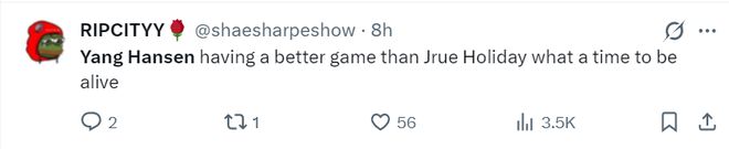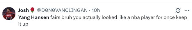 开拓者球迷:杨瀚森真的表现很好,他终于看起来像一个NBA球员了,继续保持下去吧。